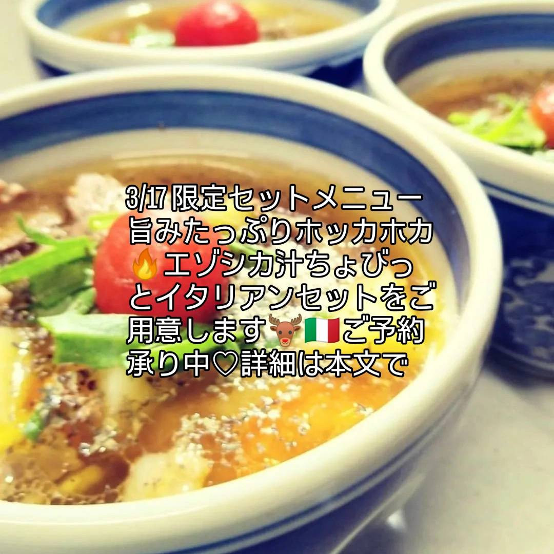 ①【3/17(火)18時〜入退店自由♪ご予約優先♪数量限定♪エゾシカ汁ちょびっとイタリアンセット/3430円】